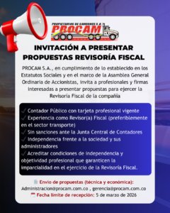 PROCAM S.A. informa que se encuentra abierto el proceso de recepción de propuestas para la selección de la Revisoría Fiscal correspondiente al período 2026-2027. 📄 Consulte la información completa a continuación: